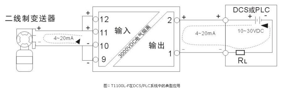 此模塊廣泛應(yīng)用在DCS和PLC系統(tǒng),在系統(tǒng)信號(hào)檢測(cè)回路中,通過(guò)金升陽(yáng)隔離變送器模塊T1100L-F模塊既能通過(guò)對(duì)輸出側(cè)取電(即輸出回路供電)供模塊正常工作,無(wú)需外接電源,有效地解決對(duì)供電電源的依賴(lài),滿(mǎn)足二線制回路供電的要求,又能有效地濾除信號(hào)中的干擾噪聲,實(shí)現(xiàn)系統(tǒng)狀態(tài)精準(zhǔn)檢測(cè),保證系統(tǒng)可靠穩(wěn)定運(yùn)行,安裝方便,可節(jié)省大量電纜和安裝維護(hù)成本,具體典型應(yīng)用方案如下圖所示: