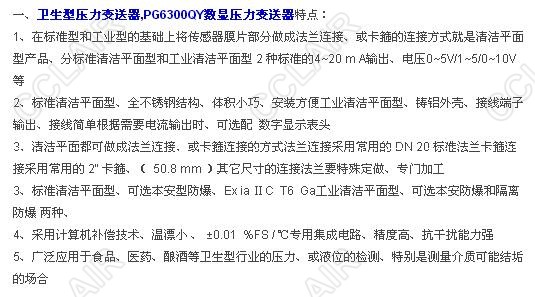 SY-PG6300QY-1MPa(卡箍連接、輸出DC4~20mA) SY-PG6300QY-1MPa-i(輸出 4~20mA、帶本安防爆) SY-PG6300QY-1MPa-M2(輸出4~20mA、帶數(shù)字顯示) SY-PG6300QY-1MPa- d(輸出 4~20mA、帶隔離防爆)