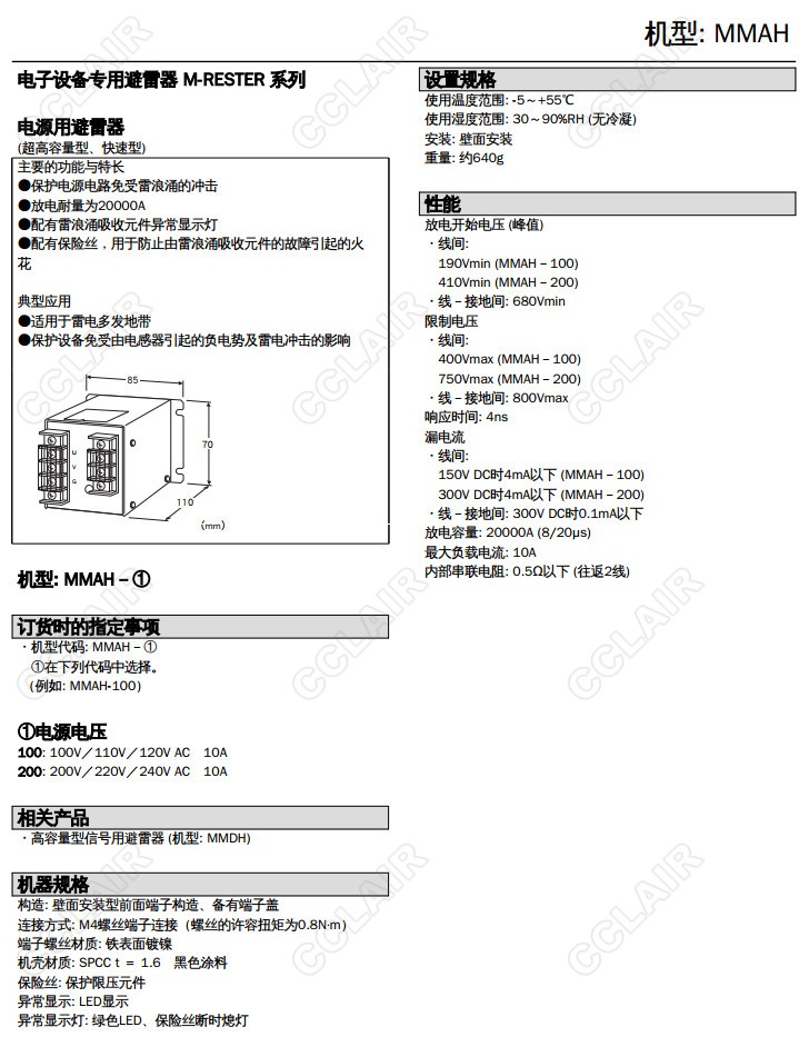 MMAH-100/MMAH-200,最大負載10A 壁面安裝 超高容量型 快速型避雷器