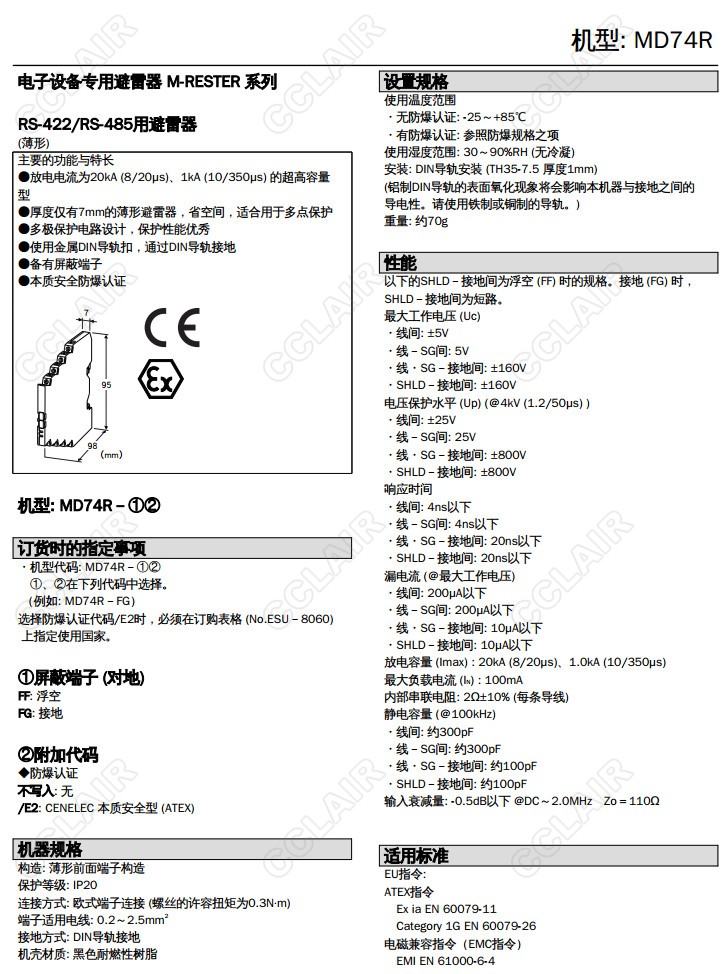 MD74R,MD74R-FG,MD74R-FF, MD74R-FG/E2,MD74R-FF/E2, RS-485/RS-422用 超薄型避雷器