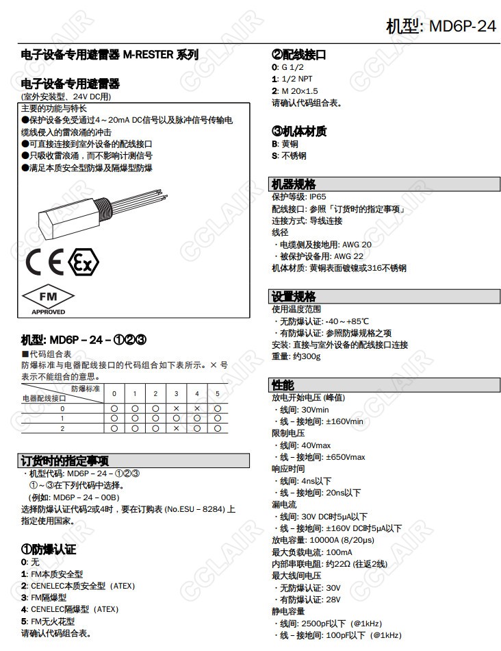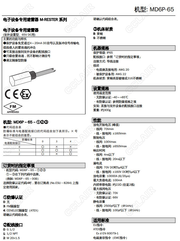 MD6P-24/MD6P-65,MD6P-24-00B,4-20mA直流、脈沖信號(hào)用 室外安裝型 引線連接型 堵頭型,避雷器