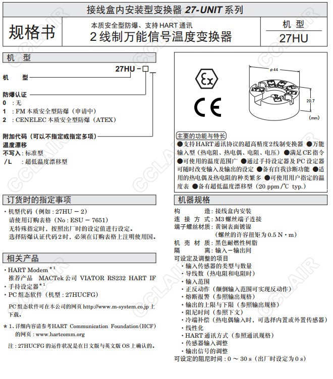 27HU,27HU-0,取得FM,CELENEC本質(zhì)安全型防爆認證 接線盒內(nèi)安裝型萬能輸入信號變換器
