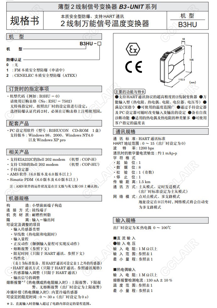 B3HU,B3HU-0,B3HU-1,B3HU-2,2線制萬(wàn)能信號(hào)溫度變換器(本質(zhì)安全型防爆、支持HART通訊)