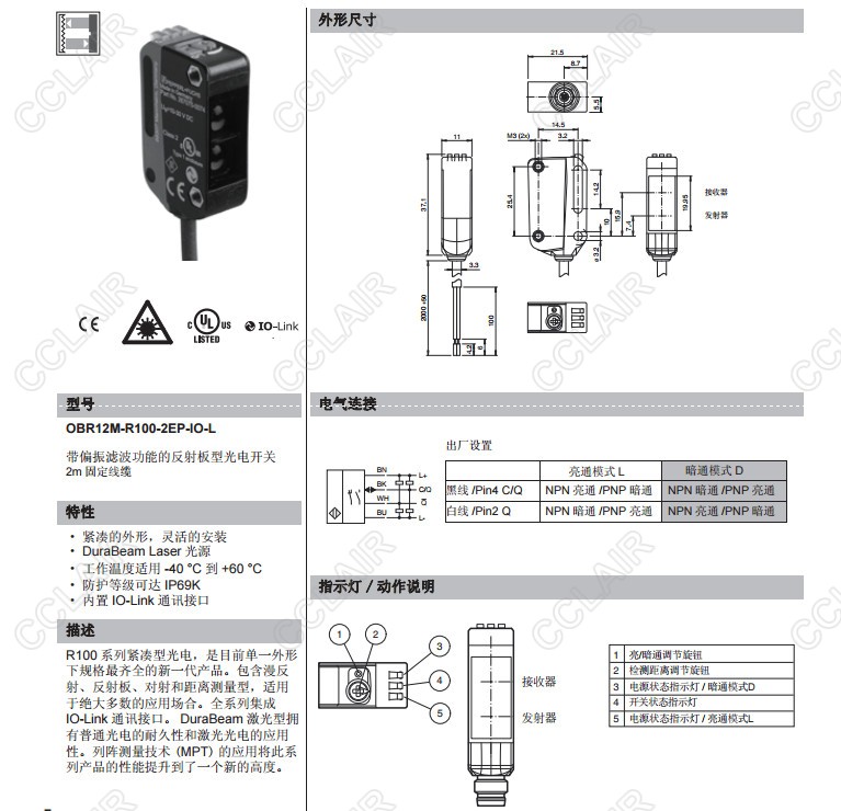 OBR12M-R100-2EP-IO-L,反射板型傳感器