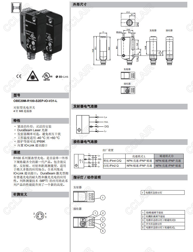 OBE20M-R100-S2EP-IO-V31-L,對射型傳感器
