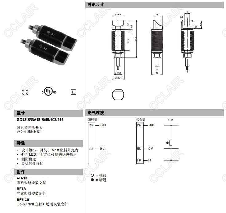 GD18-S/GV18-S/59/102/115,對射型傳感器
