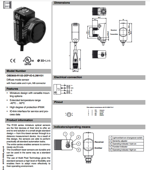 OBD800-R103-2EP-IO-0,3M-V31,漫反射型傳感