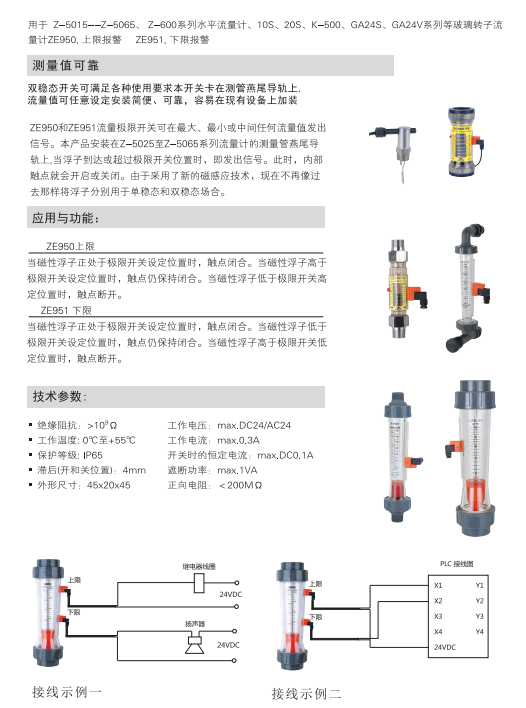 ZE950和ZE951流量極限開關(guān)可在最大、最小或中間任何流量值發(fā)出信號。本產(chǎn)品安裝在Z-5025至Z-5065系列流量計的測量管燕尾導(dǎo)軌 上,當(dāng)浮子到達(dá)或超過極限開關(guān)位置時,即發(fā)出信號。此時,內(nèi)部觸 點(diǎn)就會開啟或關(guān)閉。由于采用了新的磁感應(yīng)技術(shù),現(xiàn)在不再像過去 那樣將浮子分別用于單穩(wěn)態(tài)和雙穩(wěn)態(tài)場合。