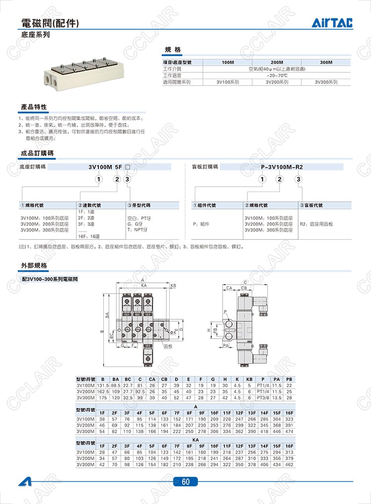 3V100M-1F,3V100M-2F,3V100M-3F,3V100M-4F,3V100M-5F,3V100M-6F,AIRTAC電磁閥底座