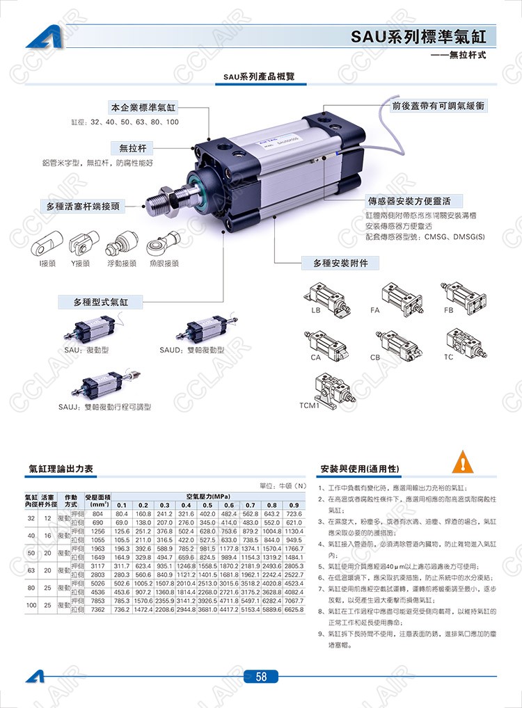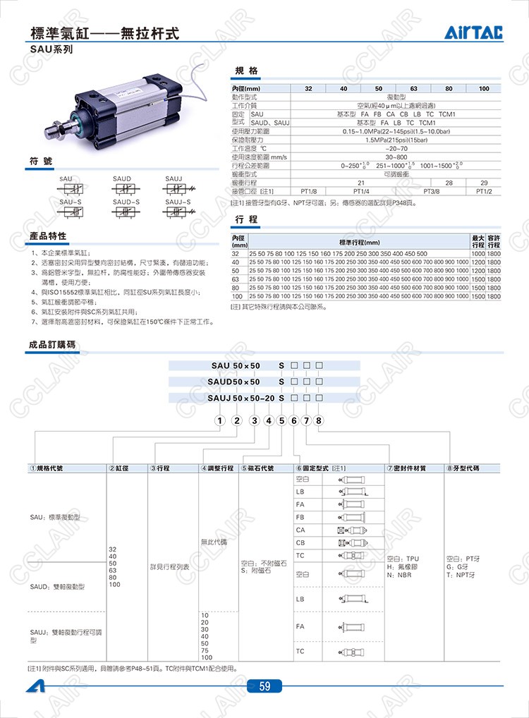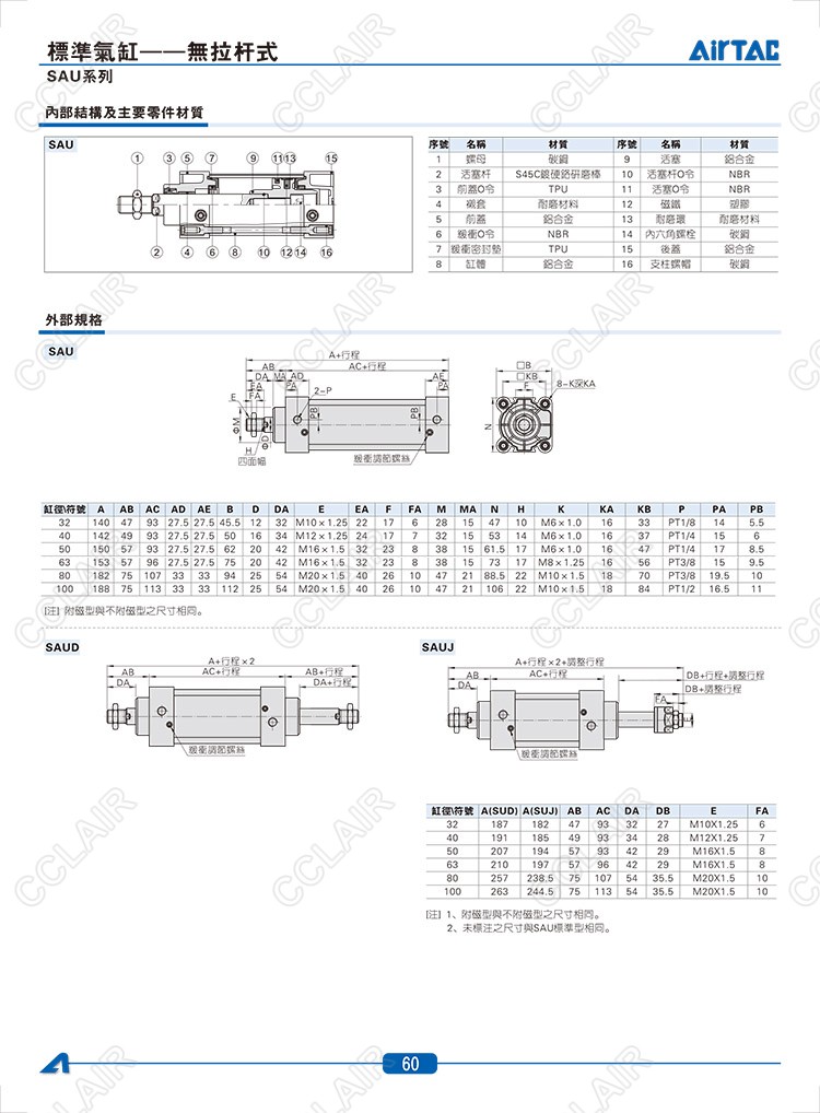 SAU32*25,SAU32*25-S,SAUD32*25,SAUD32*25-S,SAUJ32*25,SAUJ32*25-S,AIRTAC亞德客標(biāo)準(zhǔn)氣缸--無(wú)拉桿式