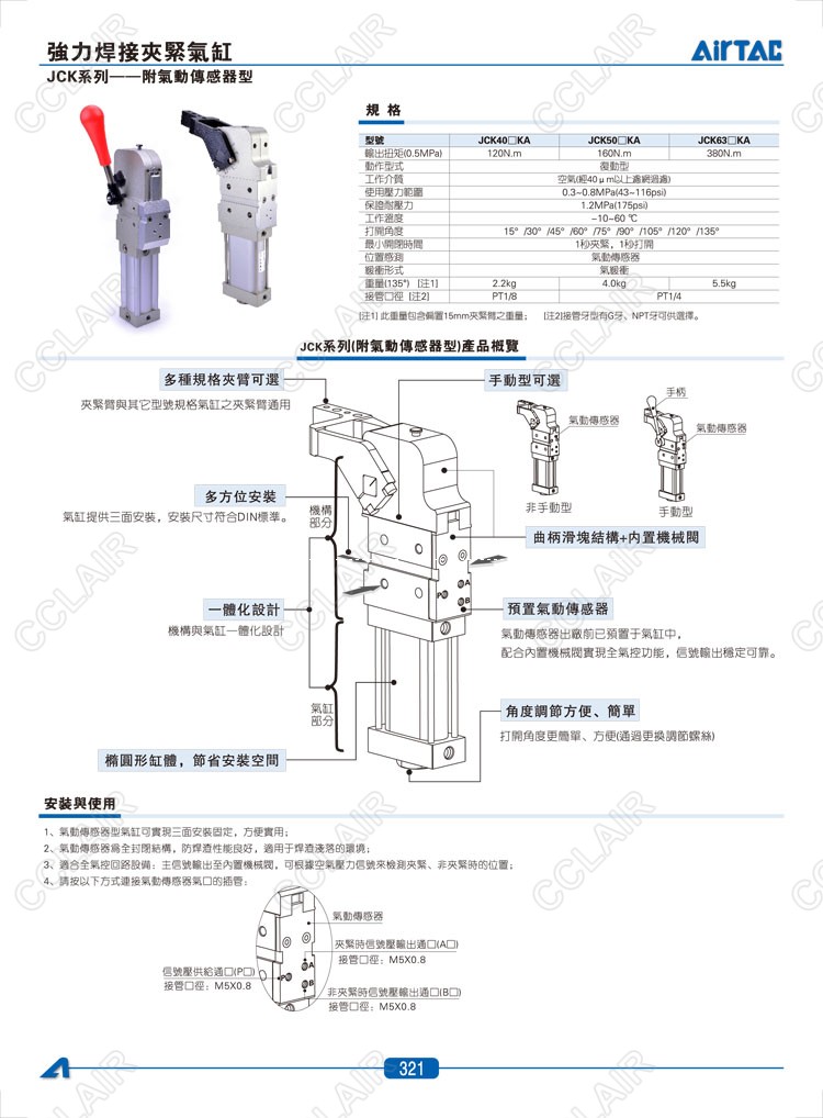 亞德客AIRTAC,JCK40KA,JCK50KA,JCK63KA,強(qiáng)力焊接夾緊氣缸-附氣動傳感器型