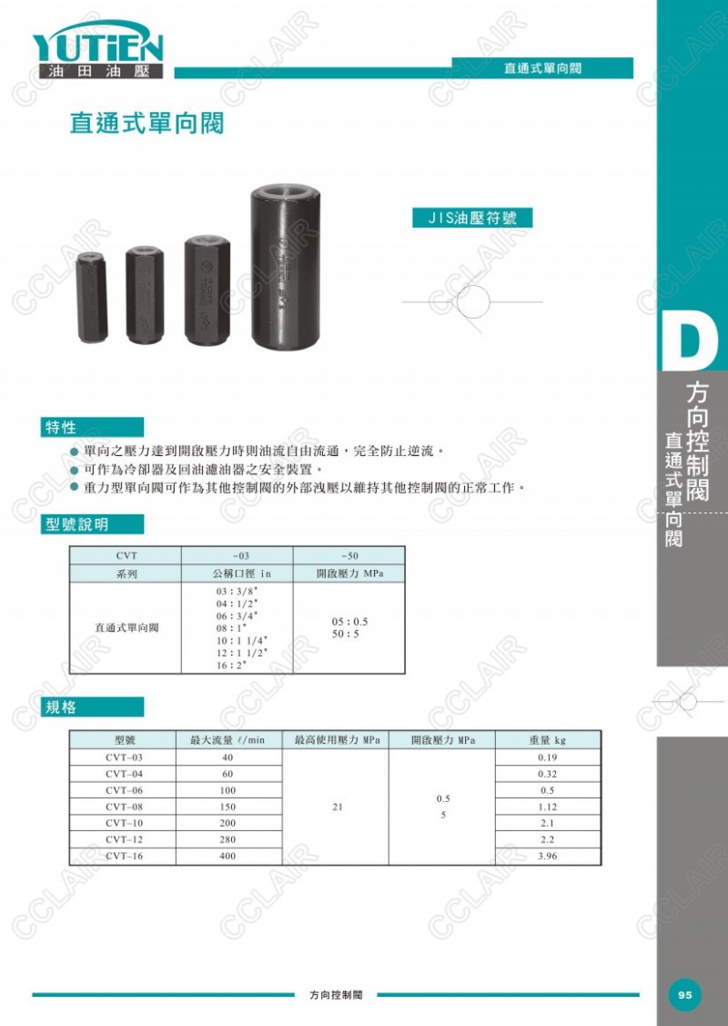 YUTIEN油田直通式單向閥CVT-03,CVT-04,CVT-06,CVT-08,CVT-10,CVT-12,CVT-16