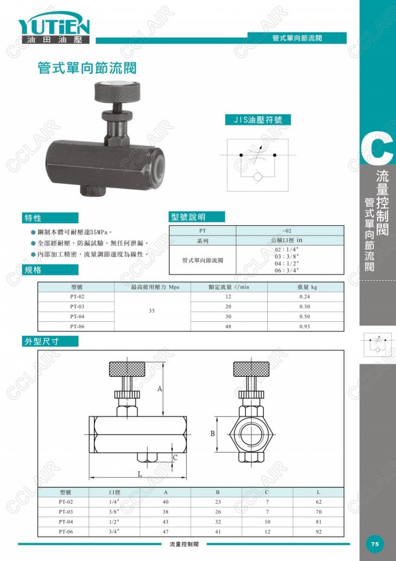 YUTIEN油田管式單向節(jié)流閥PT-02,PT-03,PT-04,PT-06