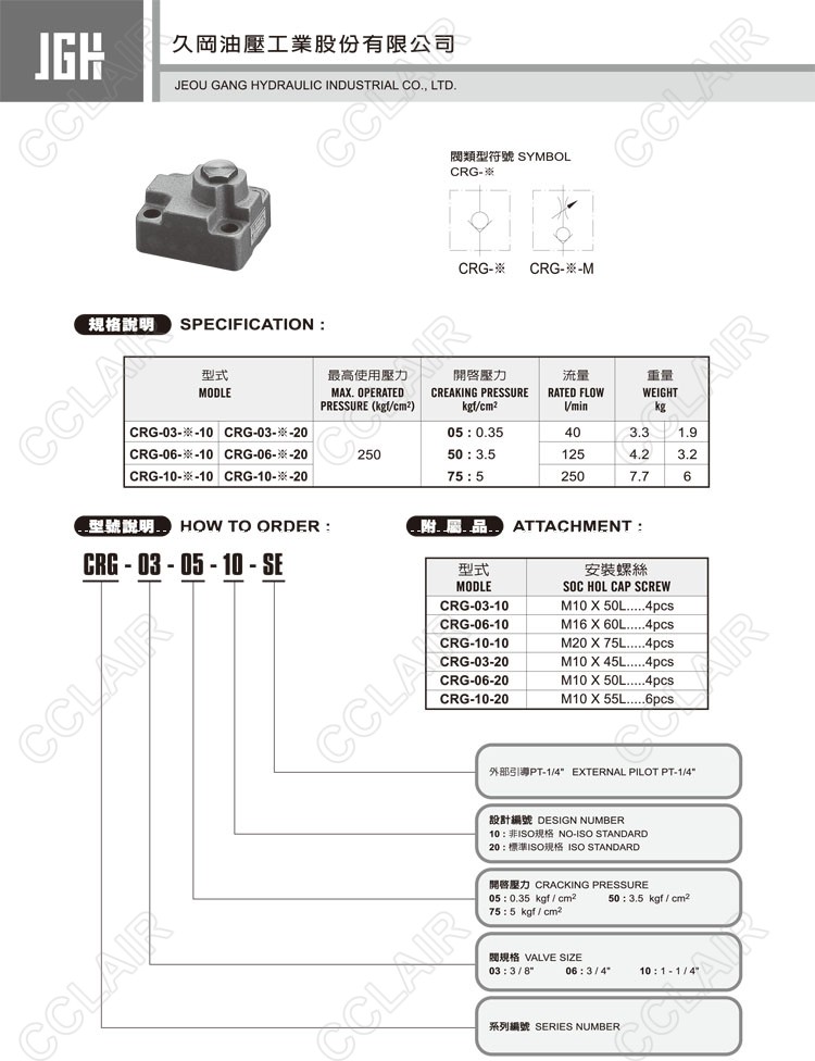 JeouGang臺灣久岡,單向閥CRG-03-05-10-SE,CRG-03-05-20-SE,CRG-03-50-10-SE,CRG-06-50-20-SE,CRG-06-75-10-SE,CRG-06-75-20-SE,CRG-10-05-10-SE,CRG-10-05-20-SE,CRG-10-50-10- SE,CRG-10-50-20-SE,CRG-10-75-10-SE,CRG-10-75-20-SE
