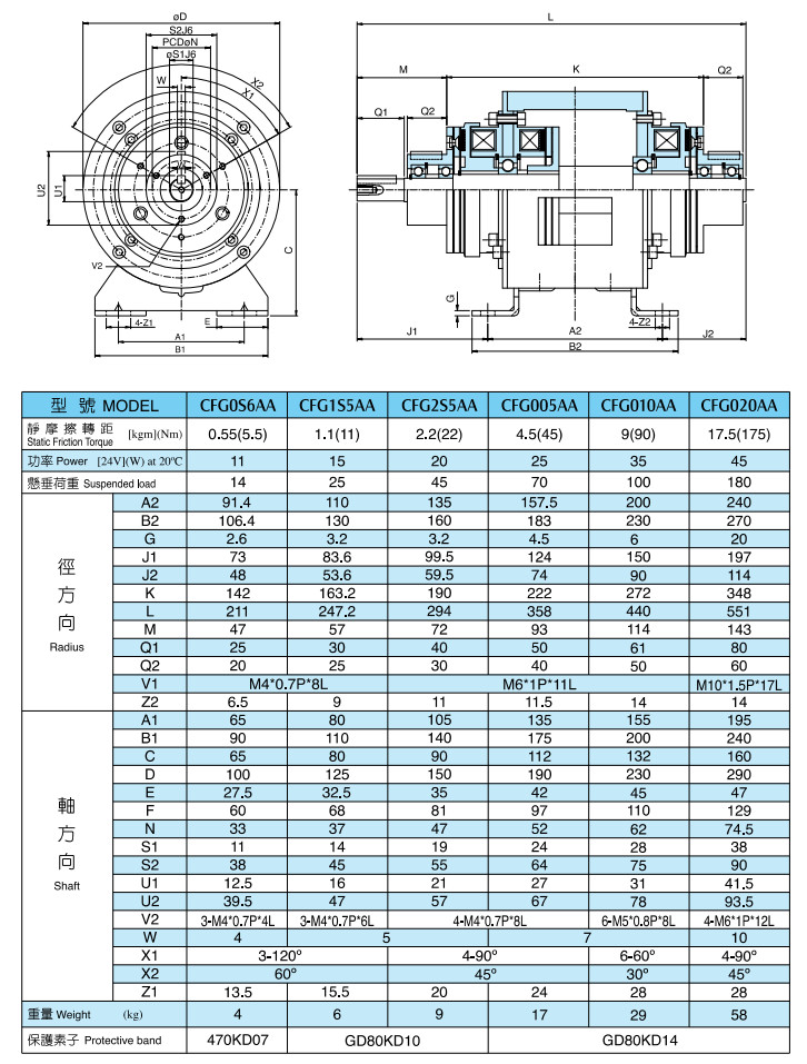 CFG0S6AA,CFG1S5AA,CFG2S5AA,CFG005AA,CFG010AA,CFG020AA雙電磁離合器內嵌電磁剎車器組