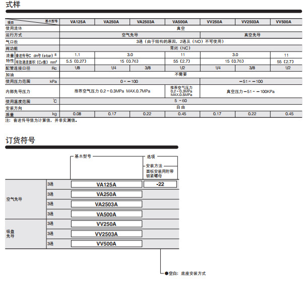 VA125A,VA125A-22,VA250A,VA2503A,VA500A,VV250A,VV2503A,VV500A,先導(dǎo)真空閥