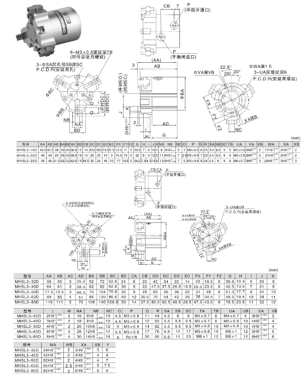氣爪氣缸 MHSL3-16D,MHSL3-20D,MHSL3-25D,MHSL3-40D,MHSL3-50D,MHSL3-63D,MHSL3-80D,MHSL3-100D