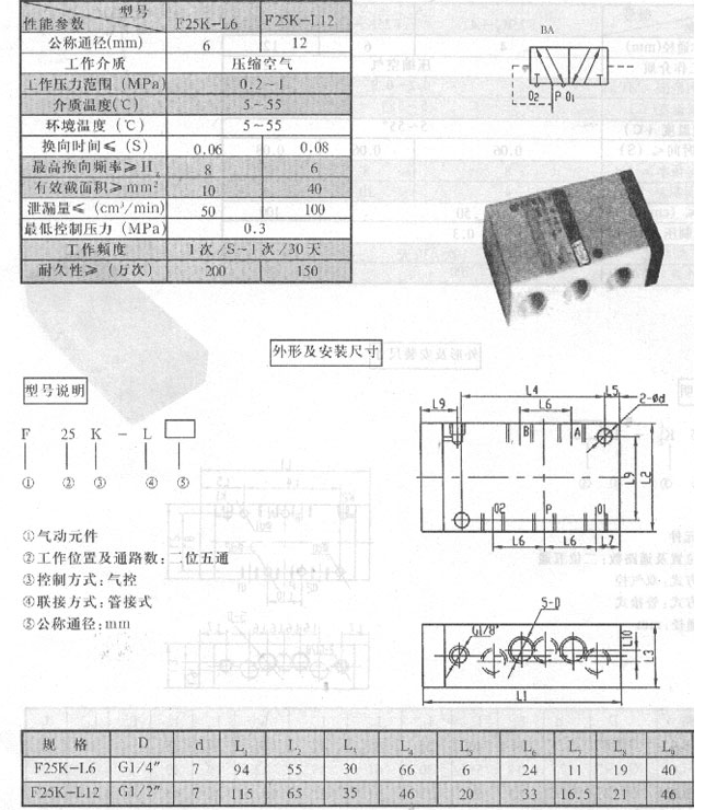 二位五通單氣控?fù)Q向閥F25K-L6,F25K-L12