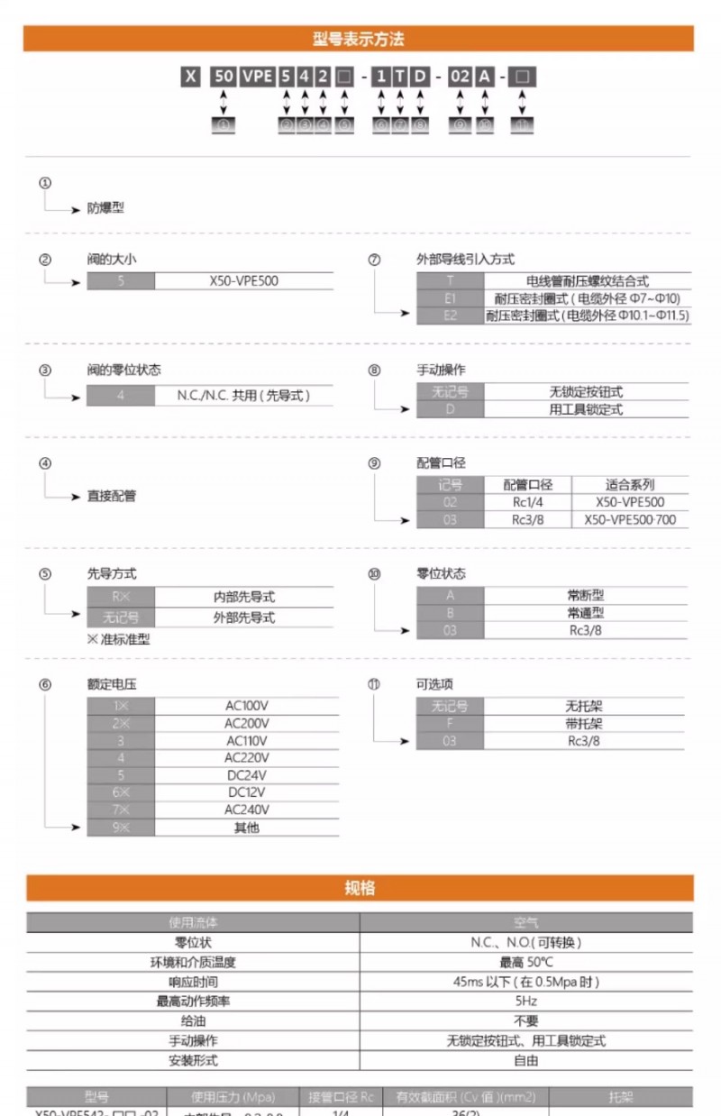 50-VFE3130-3T-02 (110VAC),50-VFE3230-3T-02 (110VAC),SMC型防爆電磁閥 50-VFE3130-4T-02 (220VAC),50-VFE3230-4T-02 (220VAC), 50-VFE3130-5T-02 (24VDC),50-VFE3230-5T-02 (24VDC), 50-VFE3130-6T-02 (12VDC),50-VFE5220-3T-03 (110VAC), 50-VFE3230-6T-02 (12VDC),50-VFE5120-3T-03 (110VAC), 50-VFE5120-4T-03 (220VAC),50-VFE5220-4T-03 (220VAC), 50-VFE5120-5T-03 (24VDC),50-VFE5220-5T-03 (24VDC), 50-VFE5120-6T-03 (12VDC),50-VFE5220-6T-03 (12VDC) , 50-VPE542-3T-03A (110VAC),線(xiàn)圈50-VF3-3T (110VAC), 50-VPE542-4T-03A (220VAC),線(xiàn)圈50-VF3-4T (220VAC), 50-VPE542-5T-03A (24VDC),線(xiàn)圈50-VF3-5T (24VDC), 50-VPE542-6T-03A (12VDC),線(xiàn)圈50-VF3-6T (12VDC),