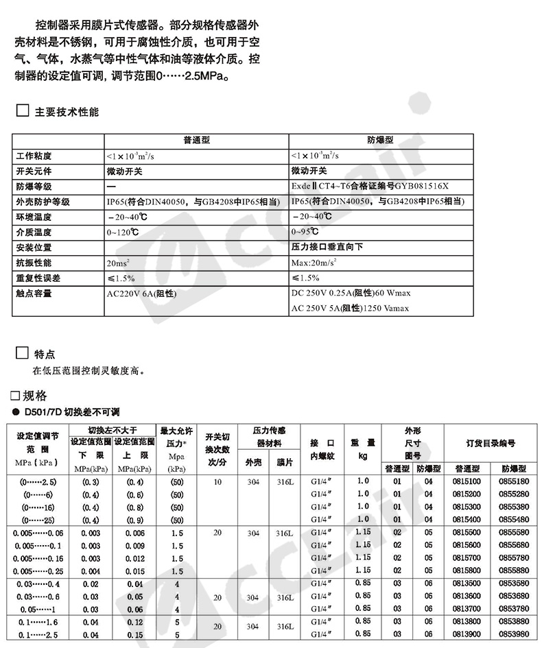 0845180,0843580,0845280,0843680,壓力控制器 防爆 D501/7D切換差可調(diào) 0845380,0843780