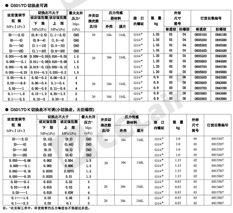 0805100,0803500,0805200,0803600,壓力控制器 普通 D501/7D切換差可調(diào) 0805300,0803700,