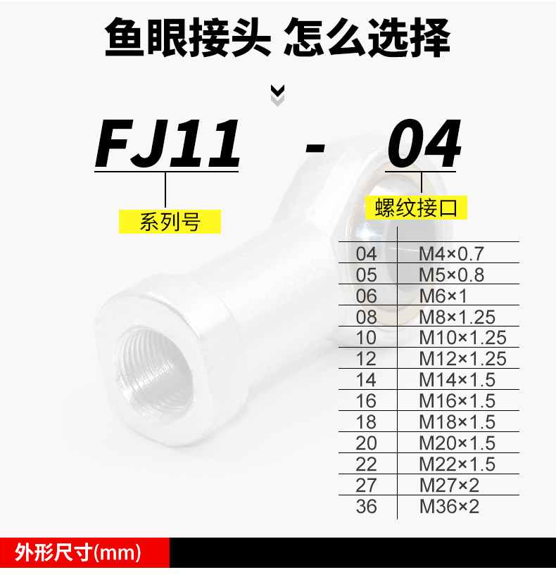 FJ11-04(M4*0.7),FJ11-05(M5*0.8),FJ11-06(M6*1),FJ11-08(M8*1.25),FJ11-10(M10*1.25),FJ11-12(M12*1.25),FJ11-14(M14*1.5),FJ11-16(M16*1.5),FJ11-18(M18*1.5),FJ11-20(M20*1.5),FJ11-22(M22*1.5),FJ11-27(M27*2)魚眼接頭