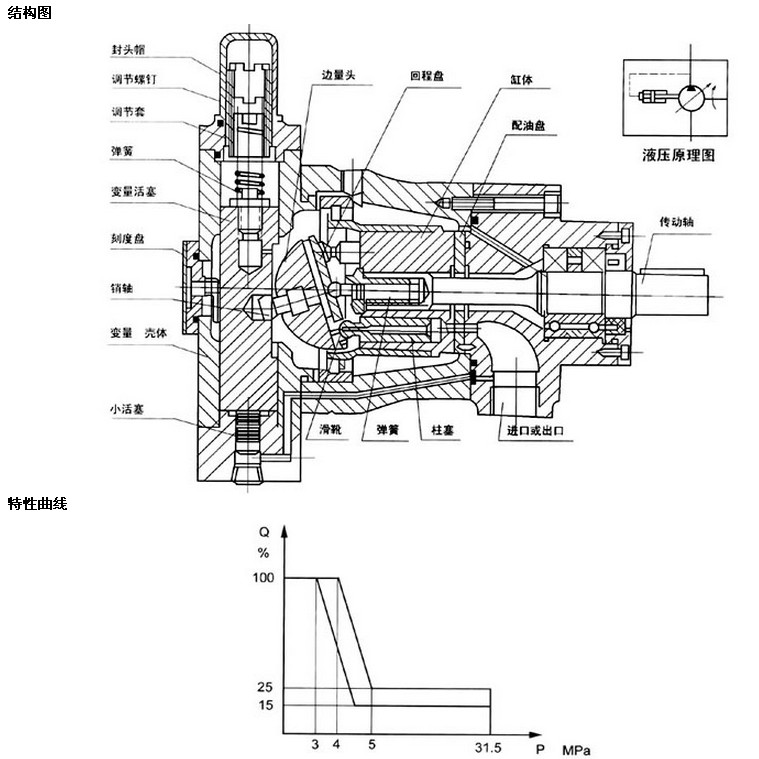 表示:排量為63毫升/轉(zhuǎn),壓力為31.5MPa的手動變量的缸體旋轉(zhuǎn)的軸向柱塞油泵。