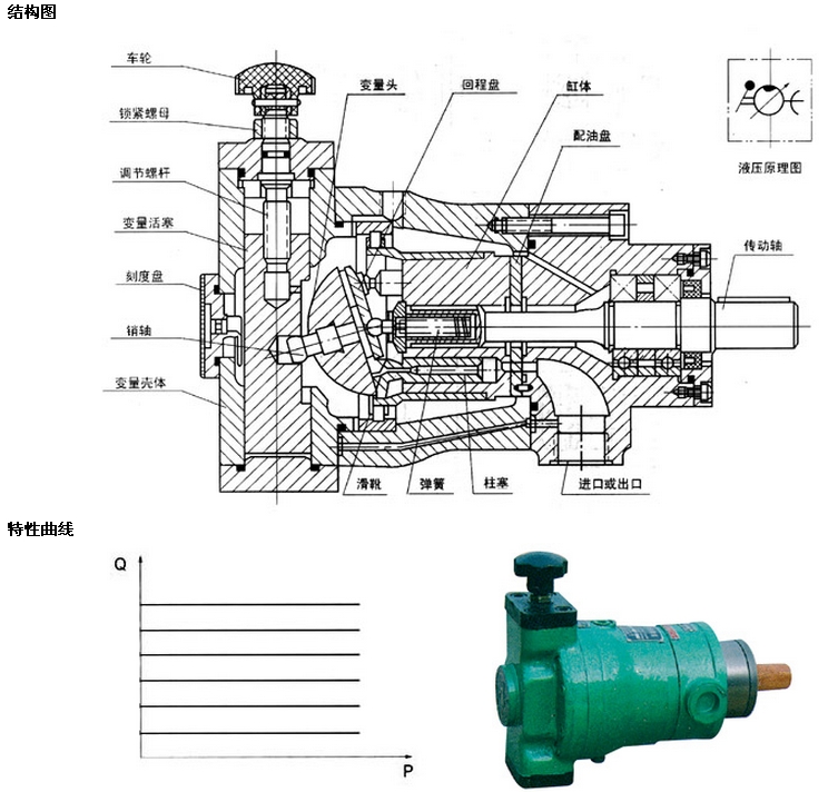 SCY型軸向柱塞泵,其原理為轉動手輪使變量活塞上下移動,帶動變量頭傾斜角變化,改變柱塞行程長短,達到變量的目的。這種變量型只適用于不頻繁