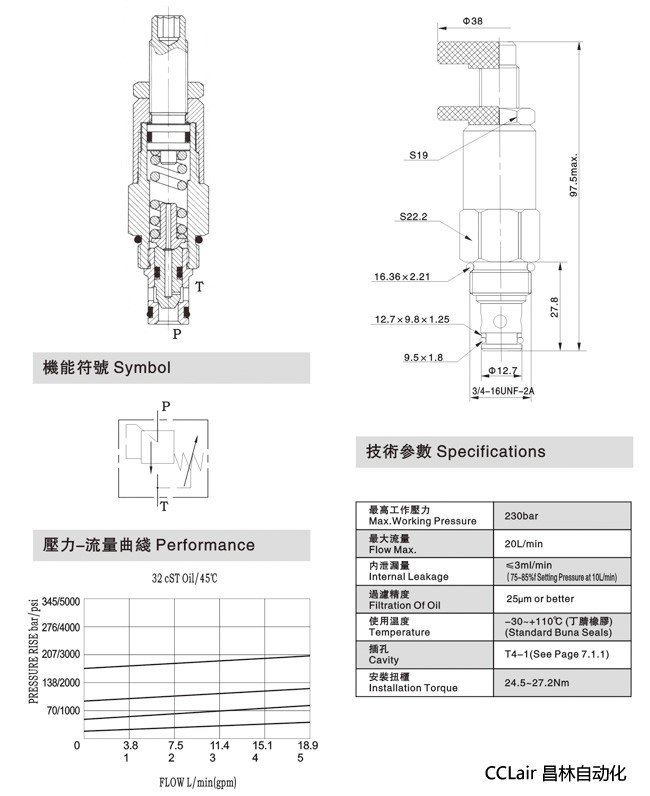 液壓閥技術(shù)參數(shù): 最高工作壓力:230bar 最大流量:20L/min 內(nèi)泄漏量:≤3ml/min 過濾精度:25μm or better 使用溫度:-30~+110℃ 插孔:T4-1 安裝扭矩:24.5-27.2Nm