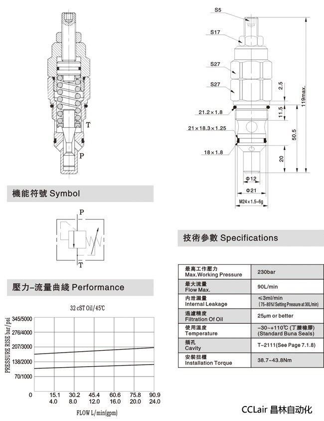 液壓閥技術(shù)參數(shù): 最高工作壓力:230bar 最大流量:90L/min 內(nèi)泄漏量:≤3ml/min 過濾精度:25μm or better 使用溫度:-30~+110℃ 插孔:T-2111 安裝扭矩:38.7-43.8Nm