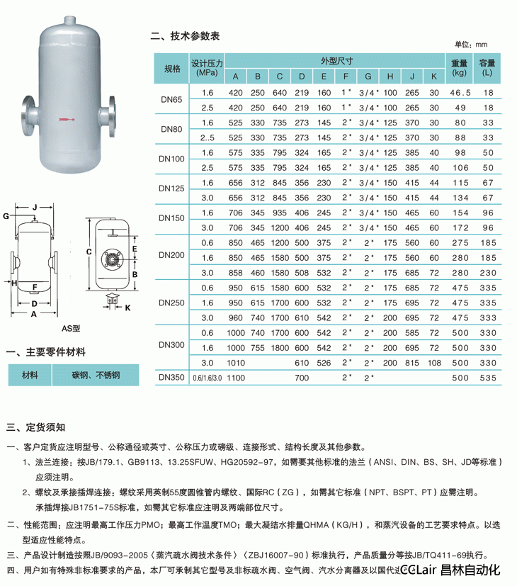 AS-PN1.6-DN150,AS-PN1.6-DN200,AS-PN1.6-DN250,AS-PN1.6-DN300,AS-PN1.6-DN350,汽水分離器 |