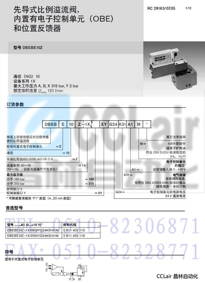 DBEBE10Z-1X/180XYG24K31A1M,DBEBE10Z-1X/315XYG24K31A1M,先導式比例溢流閥,力士樂REXROTH |