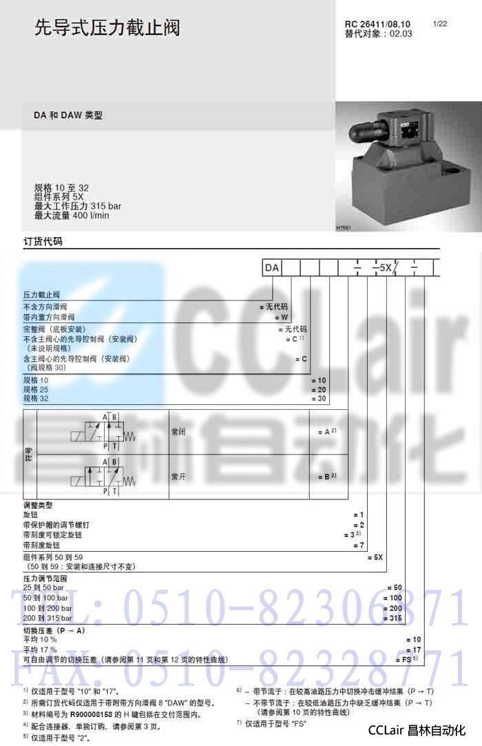 DAC2-5X/315-10V,DAC30-2-5X/200-10,DAC30-2-5X/200-10V 先導式壓力截止閥,力士樂REXROTH,德國力士樂