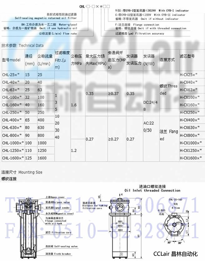 CHL-25×1,CHL-40×1,CHL-63×1,CHL-100×1,CHL-160×1,CHL-250×1,自封式磁性回油過(guò)濾器