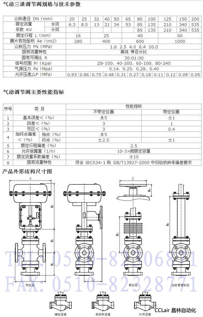 ZJSF(H)氣動薄膜三通分(合)流調節(jié)閥采用雙閥芯上下導向結構,配用氣動執(zhí)行機構,閥體為三通結構,即一進兩出(分流型),兩進一出(合流型),從而達到流體混合升溫或降溫,或流體不等量分流,滿足不同工礦的使用要求。該閥體具有結構緊湊、重量輕、動作靈敏、壓降損失小、閥容量大、流量特性精確和維修方便等優(yōu)點??捎糜诟鞣N不同的工作條件,特別適用于石油工業(yè)熱交換器的溫度控制系統(tǒng)和其他的各行業(yè)的自動化控制系統(tǒng)。本系列產品有常溫型、高溫型、低溫型、調節(jié)切斷型、波紋管密封型等多種型式。產品公稱壓力等級有PN1.6、4.0 6.4;閥體口徑范圍DN20-DN300;適用流體溫度-150℃-+560℃范圍內多種檔次;泄露等級氛分為Ⅳ級、Ⅴ級、Ⅵ級;流量特性有直線、等百分比。多種規(guī)格可供選擇。本系列調節(jié)閥采用模塊化設計,可采用不同組合、配用各種附件。