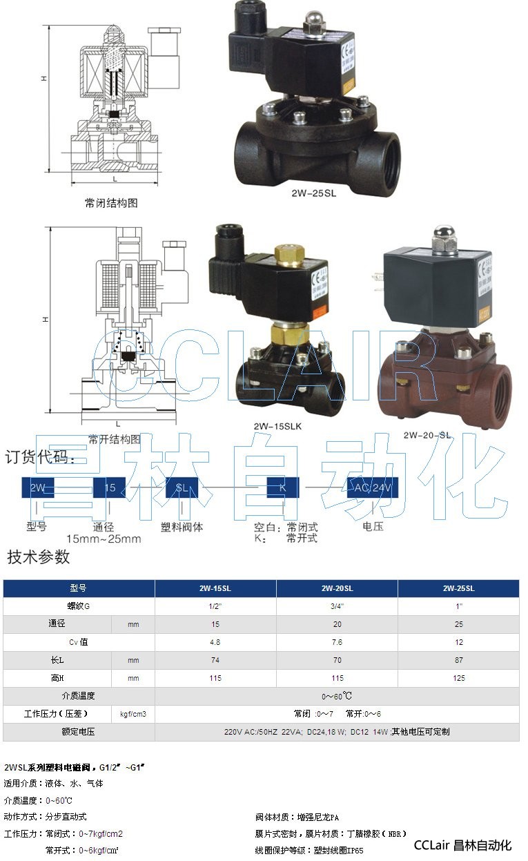 2W-15SL,2W-20SL,2W-25SL,塑料電磁閥,G1/2〞~G1〞