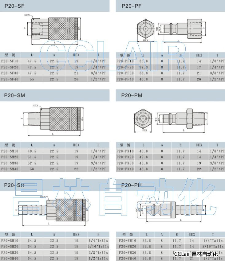 P20-SF10,P20-PF20,P20-SM30,P20-PM40,P20-SH10,P20-PH20,美式快換接頭