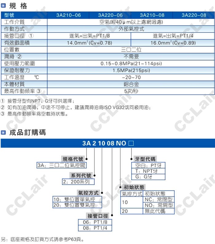3A210-06,3A220-06,3A210-08,3A220-08,3A210-06-NC-T,3A220-06-NC-G,3A210-08-NO-G,氣控閥