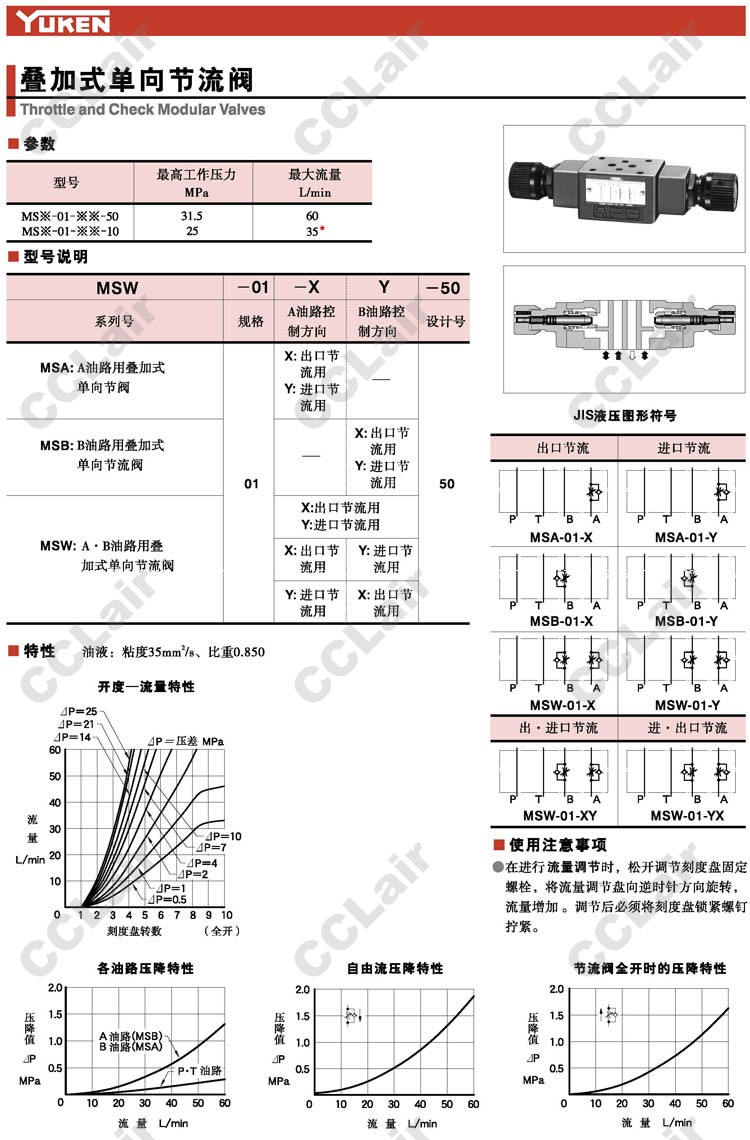 MSA-01,MSB-01,MSW-01,MSA-01-X-50,MSB-01-X-50,MSW-01-Y-50,MSW-01-XY-50,YUKEN,疊加式單向節(jié)流閥
