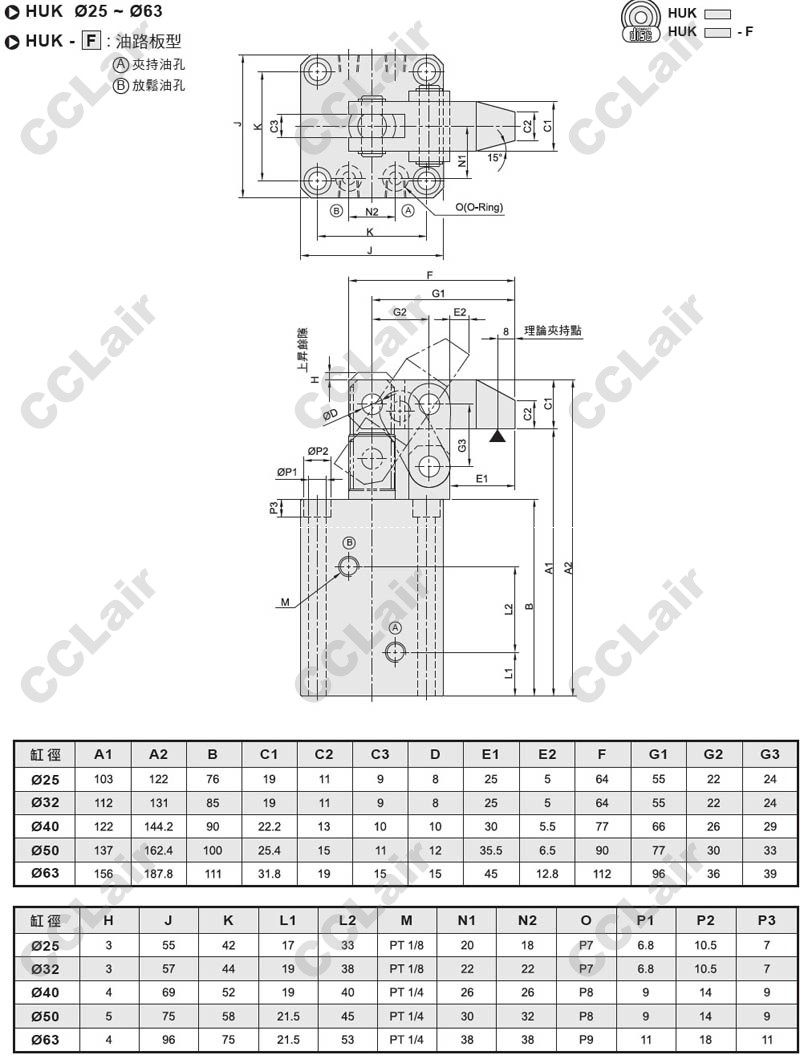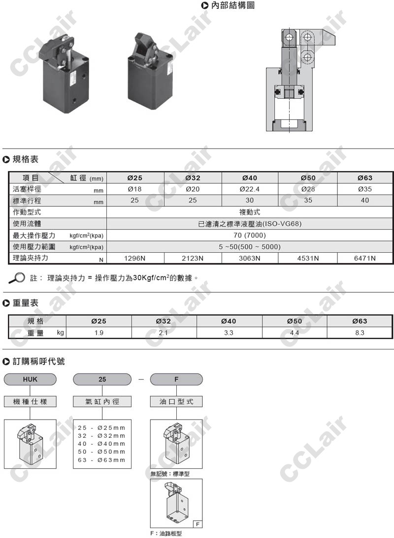 氣立可(chelic),HUK-25,HUK-32,HUK-40,HUK-50,HUK-63,HUK-25-F,HUK-32-F,HUK-40-F,HUK-50-F,HUK-63-F,油壓壓緊缸