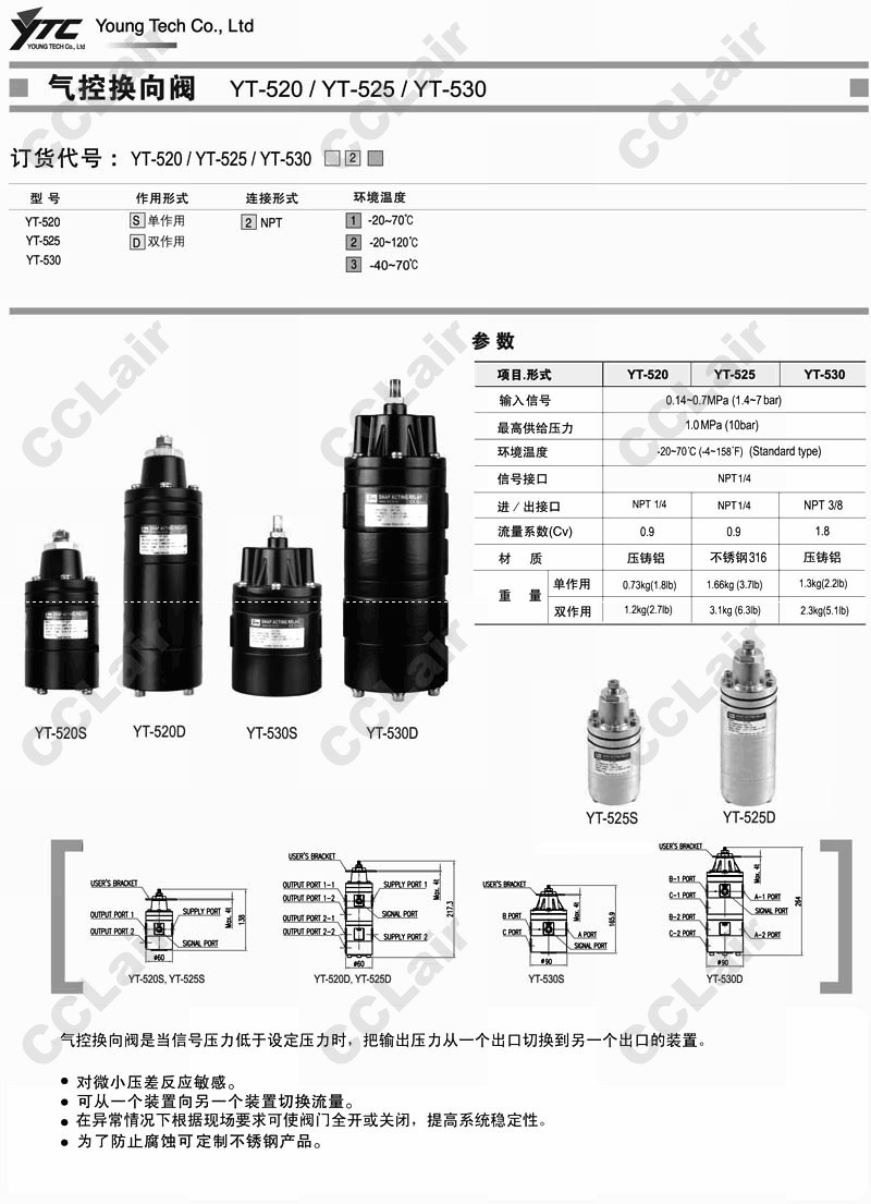 YT-520,YT-525,YT-530,YT-520S,YT-520D,YT-525S,YT-525D,YT-530S,YT-530D,YTC氣控換向閥 |