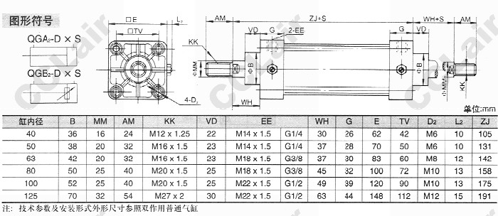 QGA2-40,QGA2-50,QGA2-63,QGA2-80,QGA2-100,QGA2-125,雙作用雙活塞桿氣缸
