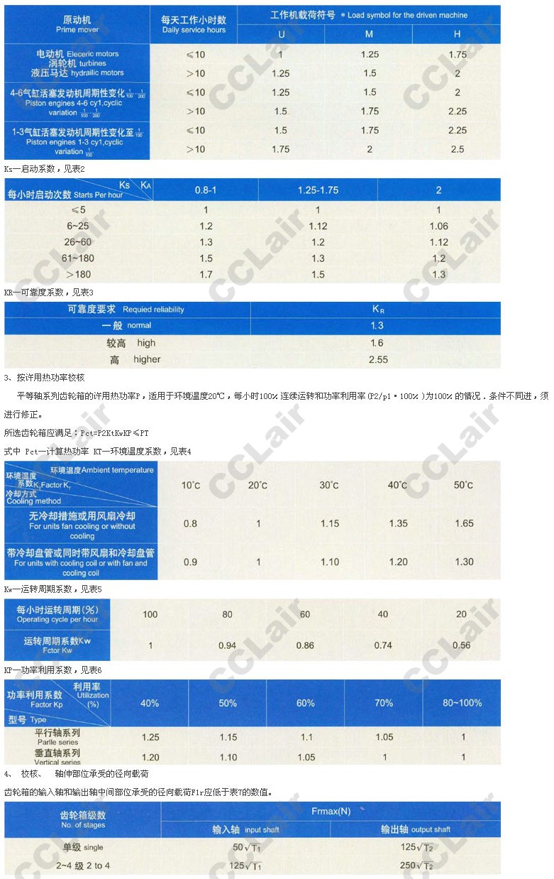平等軸系列齒輪箱的公稱輸入功率PA(表9—20)按載荷平穩(wěn),每天工作時間小于或等于10h,每小時啟動不超過5次,允許啟動轉矩為工作轉矩的2倍,單向運轉,單對齒輪的接觸強度安全系數(shù)約為1,失效率概率小于或等于1%等條件計算確定的。齒輪箱雙向運轉時,需視情況將PN乘上0.8—1.0的系數(shù),當反向載荷大,換向頻繁、選用的可靠度系數(shù)KR較低時,系數(shù)取較小值,反之取較大值。