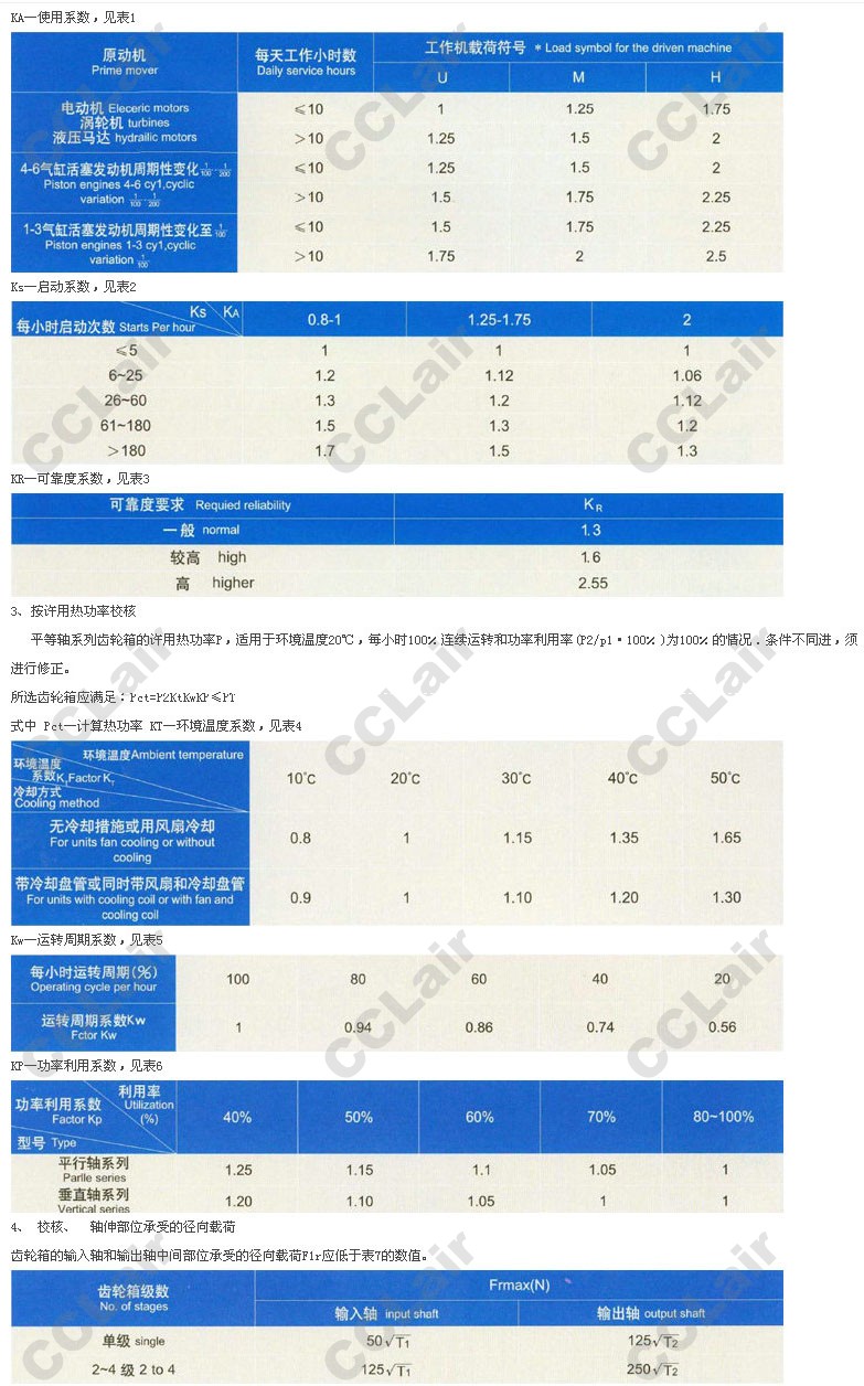 平等軸系列齒輪箱的公稱輸入功率PA(表9—20)按載荷平穩(wěn),每天工作時(shí)間小于或等于10h,每小時(shí)啟動(dòng)不超過5次,允許啟動(dòng)轉(zhuǎn)矩為工作轉(zhuǎn)矩的2倍,單向運(yùn)轉(zhuǎn),單對(duì)齒輪的接觸強(qiáng)度安全系數(shù)約為1,失效率概率小于或等于1%等條件計(jì)算確定的。齒輪箱雙向運(yùn)轉(zhuǎn)時(shí),需視情況將PN乘上0.8—1.0的系數(shù),當(dāng)反向載荷大,換向頻繁、選用的可靠度系數(shù)KR較低時(shí),系數(shù)取較小值,反之取較大值。