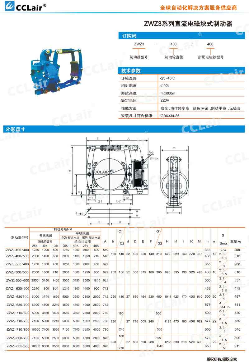 ZWZ3-400,ZWZ3-500,ZWZ3-630,ZWZ3-710,ZWZ3-800,ZWZ3-710/800,ZWZ3-500/600,直流式電磁塊式制動器