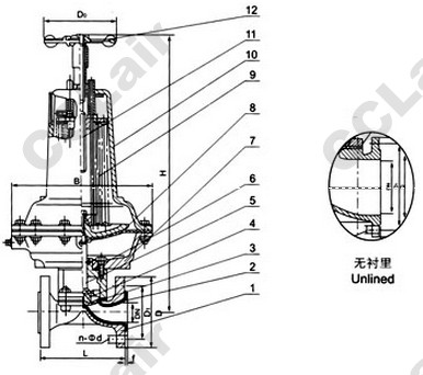 部件列表:1.閥體 2.閥體襯里 3.隔膜 4.閥瓣 5.下閥桿 6.閥蓋 7.氣缸 8.氣動(dòng)薄膜 9.彈簧 10.氣缸蓋