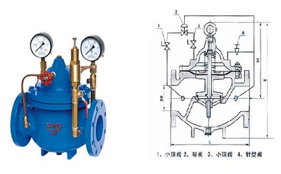 當(dāng)主閥出口壓力低于導(dǎo)閥設(shè)定的壓力時,導(dǎo)閥此時處于開通狀態(tài),主閥上腔壓力與主閥出口壓力相等,進(jìn)口與吃口存在壓差,水流經(jīng)閥口出口流出,當(dāng)消防泵氣泵時,或變平泵壓力升高時,超過導(dǎo)閥設(shè)定壓力,由主閥進(jìn)口向?qū)чy管控制室壓力升高,作用在彈簧壓力增大,向下壓緊,帶動閥芯下移,使導(dǎo)閥關(guān)閉,此時主閥進(jìn)口壓力通過節(jié)流閥補(bǔ)充到主閥閥蓋上腔,因閥瓣受到向下壓力大于向上推力,主閥關(guān)閉