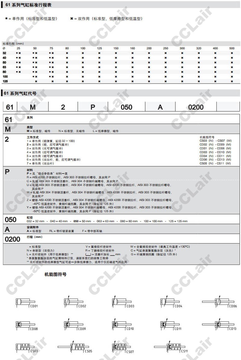 61M1P032A0100,61M2P050A0200,61M3P063A0250,61M4P080A0300,61M5P0125A0400,61N6P0100A0320,camozzi氣缸