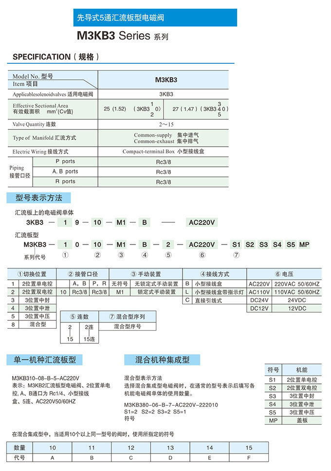 M3KB310-10,M3KB320-10,M3KB330-10,M3KB340-10,M3KB350-10,M3KB380-10,M3KB310-10-B,先導式5通匯流板型電磁閥 |