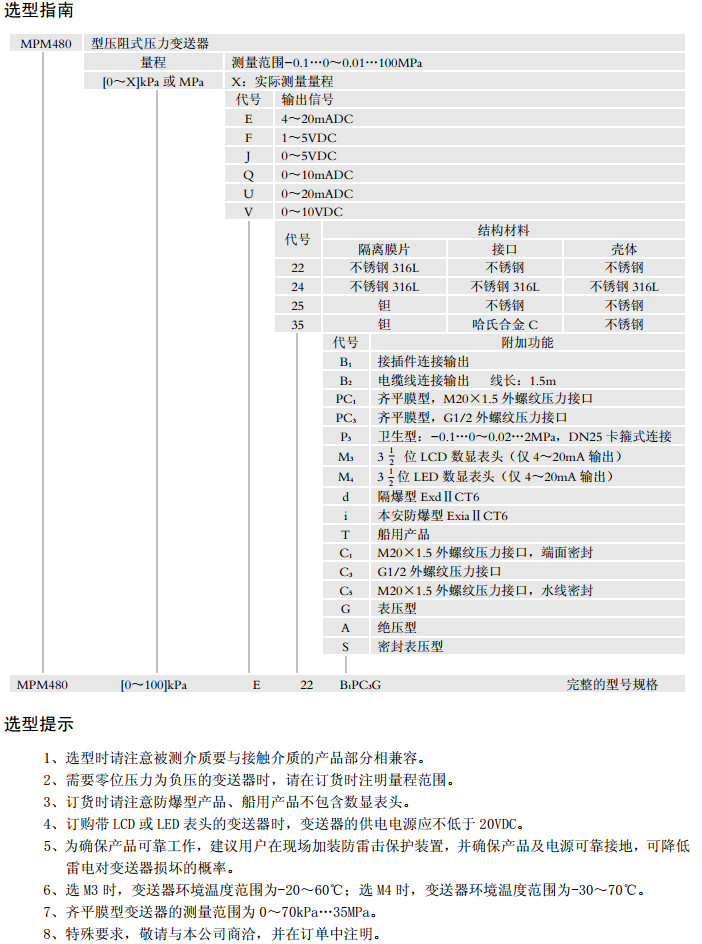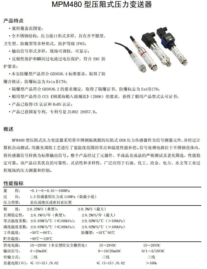 MPM480-0.1,MPM480-100,壓阻式壓力變送器